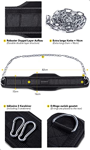 MIT STAHLKETTE + 2 KARABINER: im Lieferumfang enthalten ist eine 96cm lange Kette aus hochwertigem Stahl und zwei Stück Karabiner. Der Gürtel kann somit ganz individuell auf alle Bedürfnisse und Gewichte eingestellt werden.