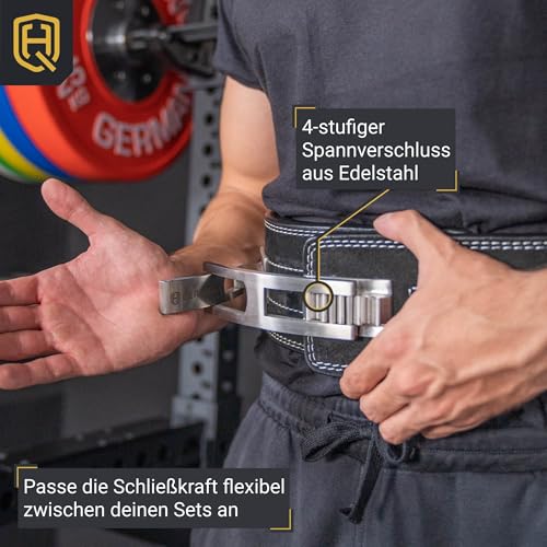 ✅𝗘𝗗𝗘𝗟𝗦𝗧𝗔𝗛𝗟 Der aus 100% Edelstahl bestehende Spannverschluss von unserem Kreuzheben Gürtel lässt sich über 4 Stufen flexibel zwischen deinen Sets anpassen. Zusätzlich kannst du die Position der Schnalle über eine Verschraubung anpassen.