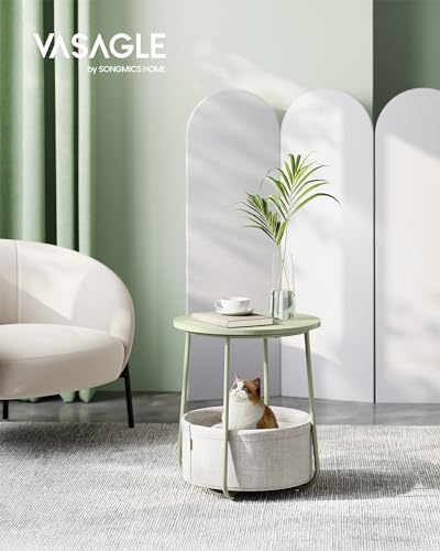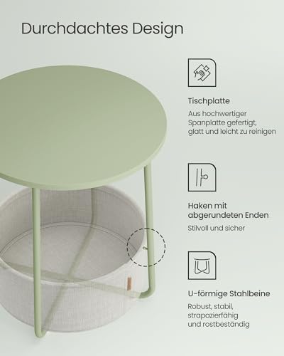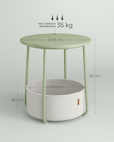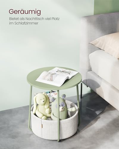 VASAGLE Beistelltisch rund, Kleiner Tisch, Couchtisch klein, Wohnzimmertisch, Korb aus Stoff, Stauraum für Wohnzimmer Schlafzimmer, Nachttisch modern, lorbeergrün-cremeweiß LET223C69