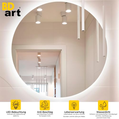 BD ART – Wandspiegel – Badspiegel – Rund Ø70cm – mit LED Beleuchtung – Lichtfarbe Kaltweiß 4200K, IP44 – Spiegel Groß – Mirror – Ganzkörperspiegel – Bad Wand Spiegel (Luna_RUND, Ø 70 cm)