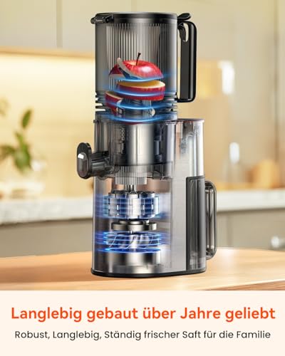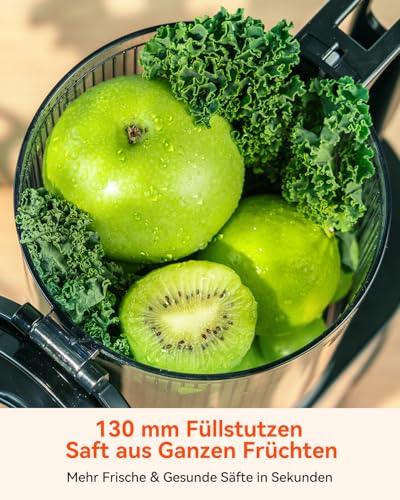 Slow Juicer Testsieger, Entsafter für Ganze Gemüse und Obst, Juicer Machine mit 130 mm Einfüllöffnung, 1,8L, BPA-frei, 250W, Rücklauffunktion, einfache Reinigung, Edelstahl Schwarz