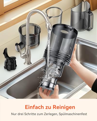 Einfache Reinigung: Alle Teile sind abnehmbar und spülmaschinenfest. Der Entsafter stoppt automatisch beim Öffnen des Deckels – sicher und kinderfreundlich
