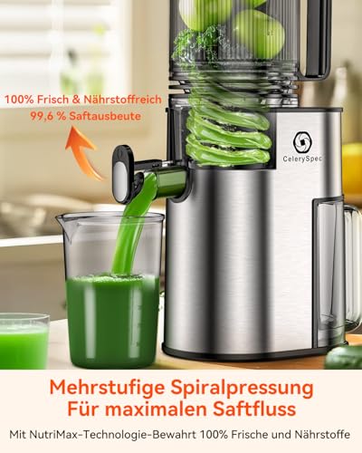 NutriMax Technologie mit 99,6 % Saftausbeute: 50–65 U/min, mehrstufige Spiralpressung für 100 % frischen, nährstoffreichen Saft. Weniger Schaum, mehr Vitamine