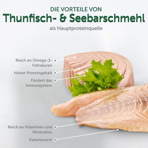 Thunfisch & Wolfsbarsch – Proteinreich & fettarm, mit Omega-3 zur Gewichtskontrolle. Enthält Vitamine B12 & D zur Unterstützung des Immunsystems erwachsener Hunde. Premium-Proteinquelle für Vitalität