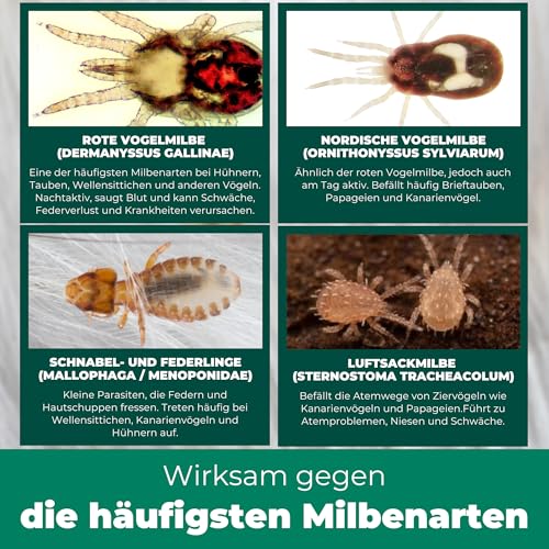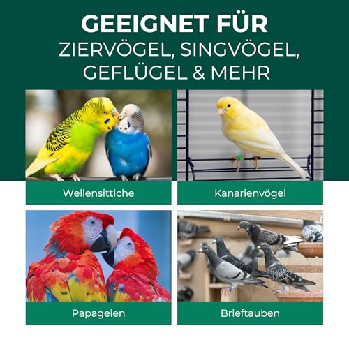 Effektiver Schutz für Ziervögel: Schützt Wellensittiche, Kanarienvögel, Papageien, Beos, Großsittiche & Brieftauben vor Milben, Federlingen und Parasiten. Reduziert den Befall schnell und verhindert eine erneute Ausbreitung im Gefieder und in der Umgebung.