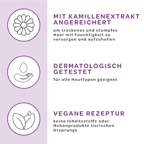 Feuchtigkeitsspendend und glänzend: Shampoo für sprödes Haar mit Kamillenextrakt, bekannt für seine feuchtigkeitsspendende Wirkung. Das Haar wird geschmeidiger und glänzender aussehen.