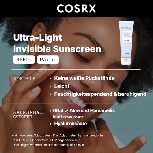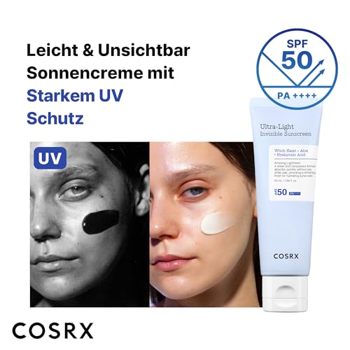COSRX Ultra-Light Invisible Sunscreen | Sonnencreme LSF 50, Kein Weißer Rückstand, Leicht & Schnell einziehend, Sonnenschutz für trockene Haut, Aloe Vera Sunscreen, Korean Skincare